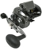 It features a multi-disc, carbonite drag system, balanced aluminum handle arm with Ergo grip handle knob, quick-set anti-reverse, 2 tone anodized aluminum spool, mechanical line counter function measures in feet and automatic trip, spool engaging mechanism. * Right hand model shown